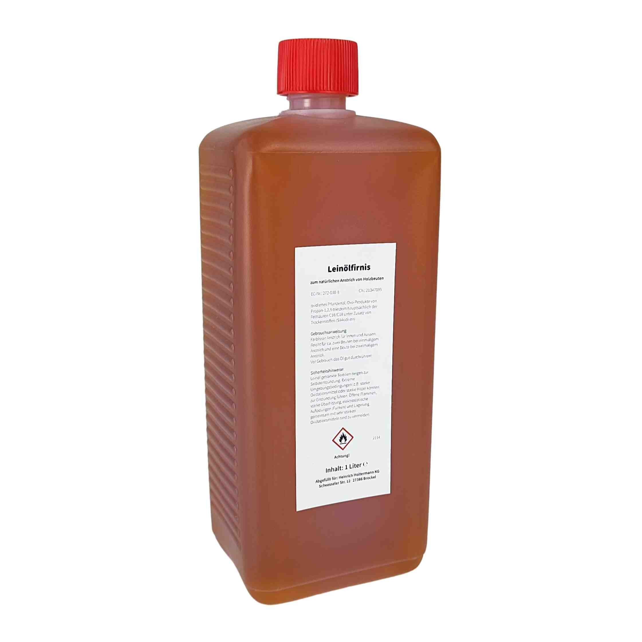 Natürliches, antistatisches, sikkativiertes Leinöl mit guter Trocknungsgeschwindigkeit, zur Behandlung und als natürlicher Anstrich von Bienenbeuten aus Holz. Tipp: Firnis etwas erwärmen damit das Öl besser in die Poren eindringt! Vorteile von Leinöl: Gutes Eindringvermögen, Wasserabweisende Wirkung, Egalisierung des unterschiedlichen Saugvermögens. Besondere Eigenschaften: Kinderspielzeuggeeignet, Schweiß- und Speichelecht.